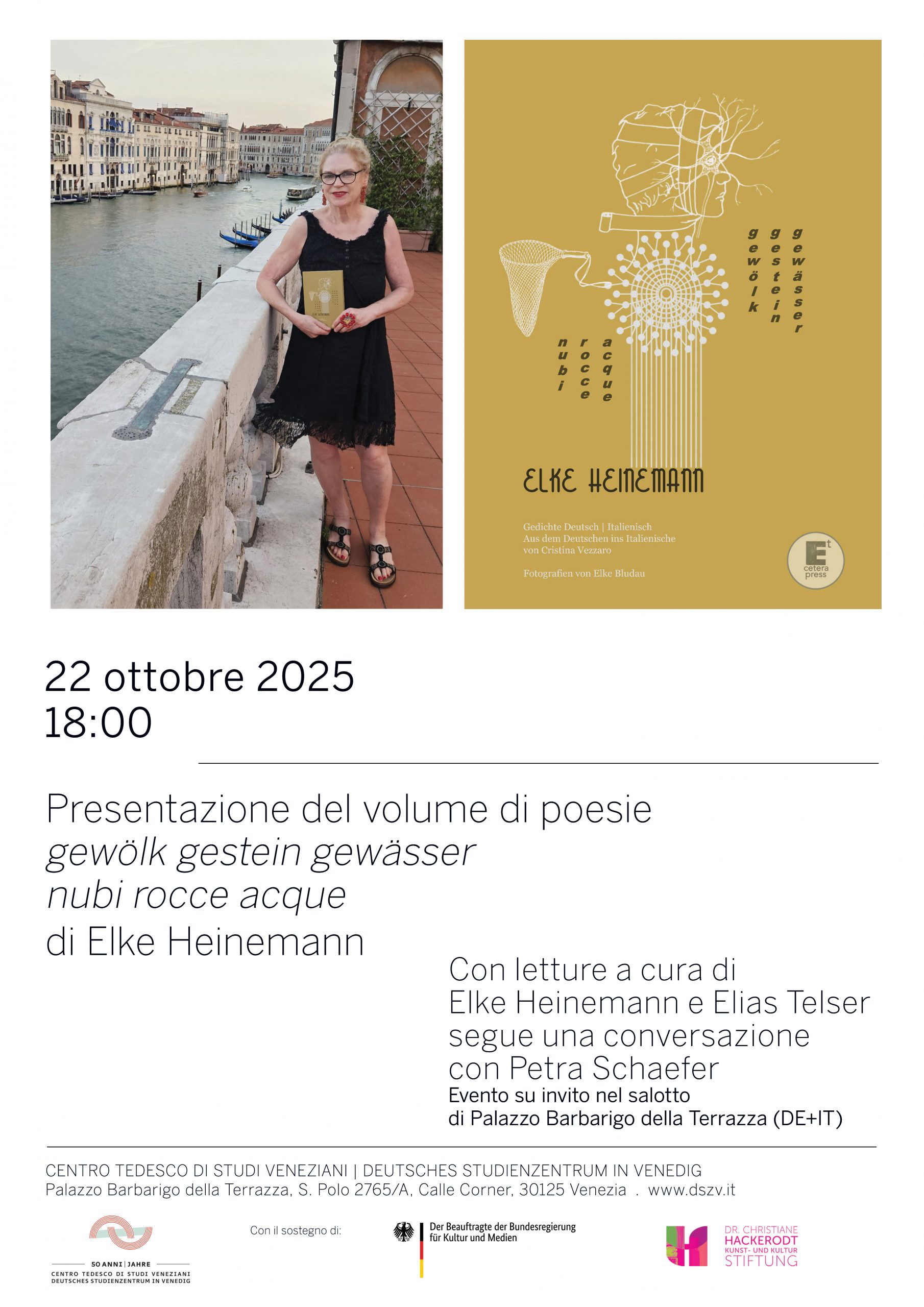 Ich stelle im Gespräch mit Petra Schaefer vom Deutschen Studienzentrum in Venedig und Elias Telser vom venezianischen Kulturverein Casa delle parole mein neues Buch gewölk gestein gewässer / nubi rocce acque auf Deutsch und Italienisch vor. Der Lyrikband mit den drei Gedichtzyklen gewölk gestein gewässer, Fotografien von Elke Bludau und Grafiken von Erec Schumacher liegt seit Juli 2025 im deutschen Original und in italienischer Übersetzung im avancierten Berliner Independent Verlag etcetera press berlin vor. Bestellen kann man das Buch beispielsweise hier: https://www.etceterapressberlin.com/books