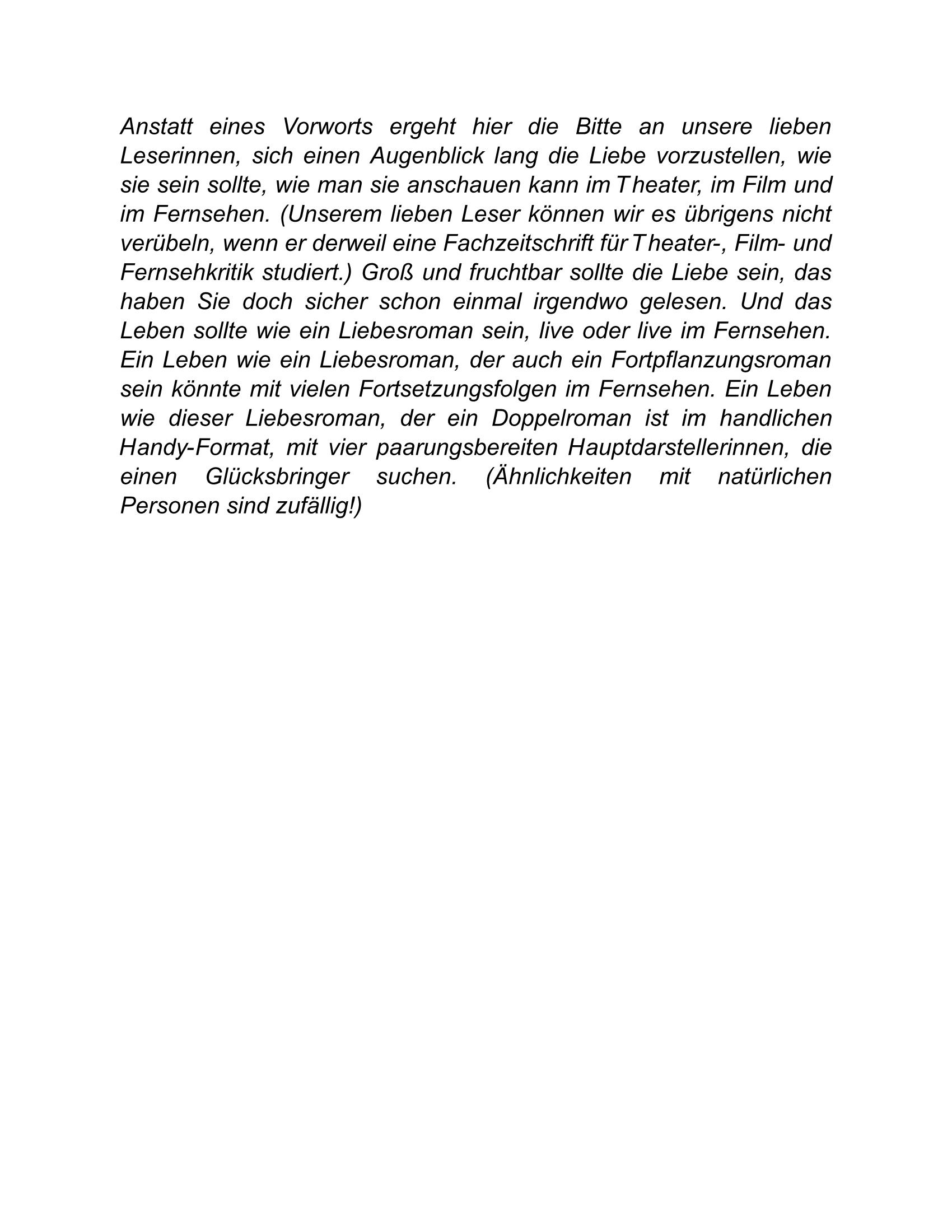 Ein handlicher Liebesroman mit vier paarungsbereiten Hauptdarstellerinnen, die einen Glücksbringer suchen: Brigitte & Petra (20) und Emma & Marie-Claire (40) lieben Bert, den Leiter des Spielplans, der Zeitschrift für Theater-, Film- und Fernsehwissenschaften. Brigitte sucht nach einem Helden und Versorger, Petra würde für die Ferienkasse auch Krankengymnastin lernen, Marie-Claire wird zur späten Mutter eines Sohns und Emma zur späten Mutter eines Klons. Und der Vater geht leer aus. (An-)Gewandte Sprach-, Medien- und Genderkritik!