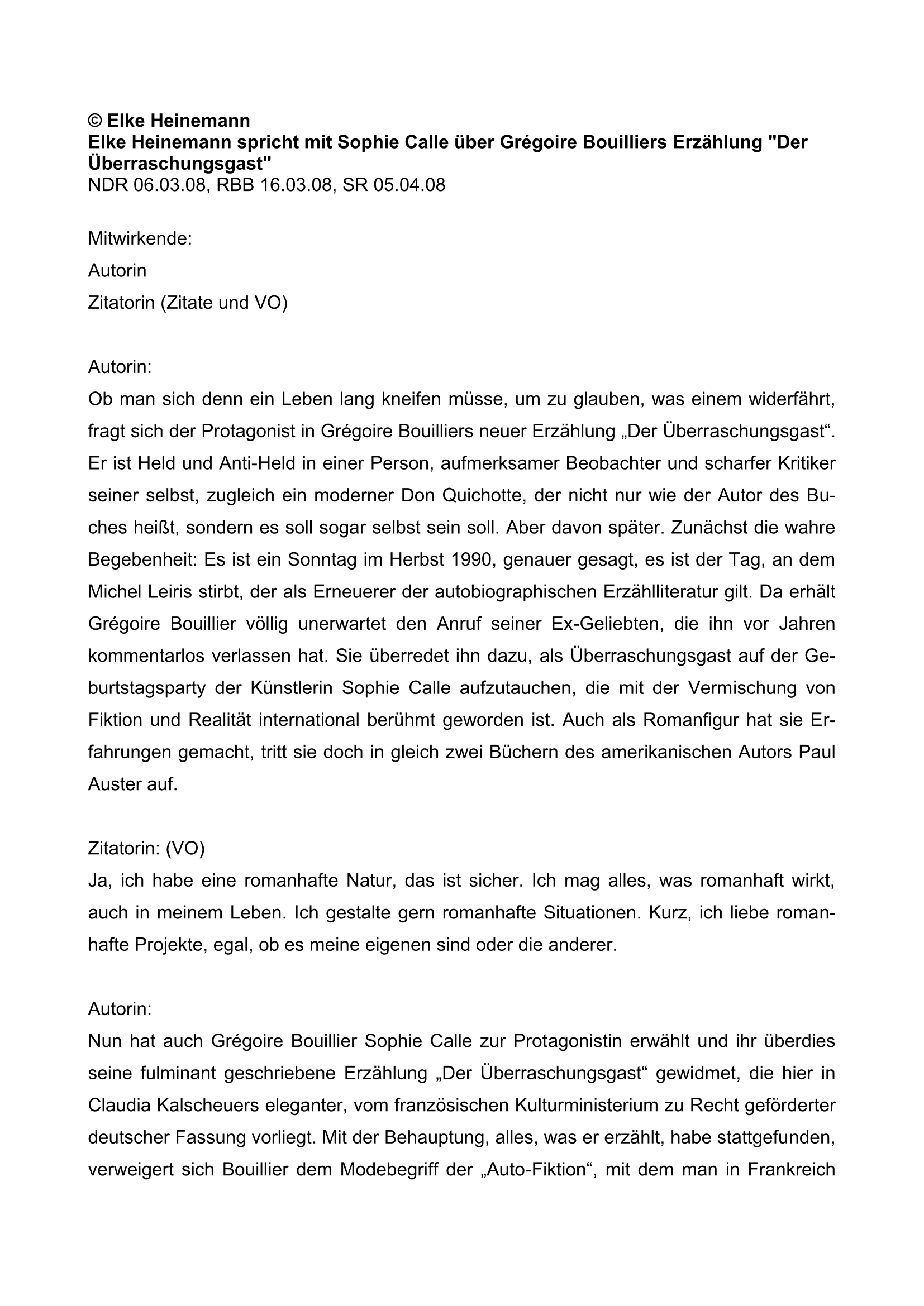Elke Heinemann spricht mit Sophie Calle über Grégoire Bouilliers Erzählung „Der Überraschungsgast“